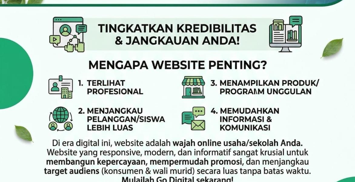 Di era digital 2026, pelanggan Surabaya dan Sidoarjo mencari semua lewat Google dan asisten suara. Tanpa website responsif, UKM Anda kehilangan 70% calon pembeli. Lembaga pendidikan seperti sekolah, kursus, atau kampus juga butuh situs resmi untuk pendaftaran online, info akademik, dan branding kredibel.